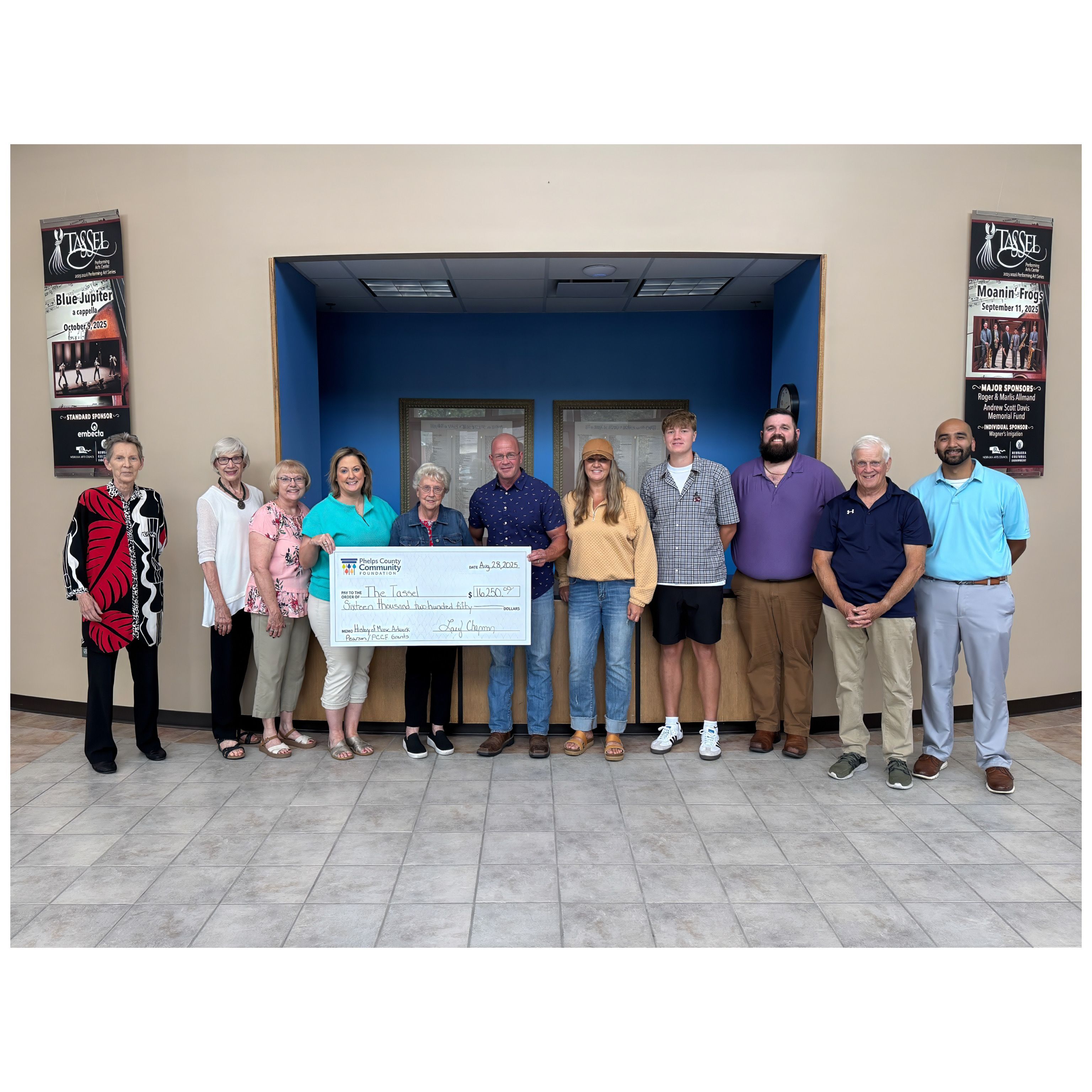 The first grant, for $9,750, is from the Roy W. & Mary L. Pearson Charitable Fund, and the second, for $6,500, is made possible through the William & Margaret Richards Field of Interest Fund and the Phelps County Community Foundation Community Impact Fund. Additional costs of the artwork and overall project will be paid for by the Tassel Coordination Council from funds secured through donations and concert ticket sales. Work is expected to begin on the project immediately and be completed within one year of the start date, likely earlier.